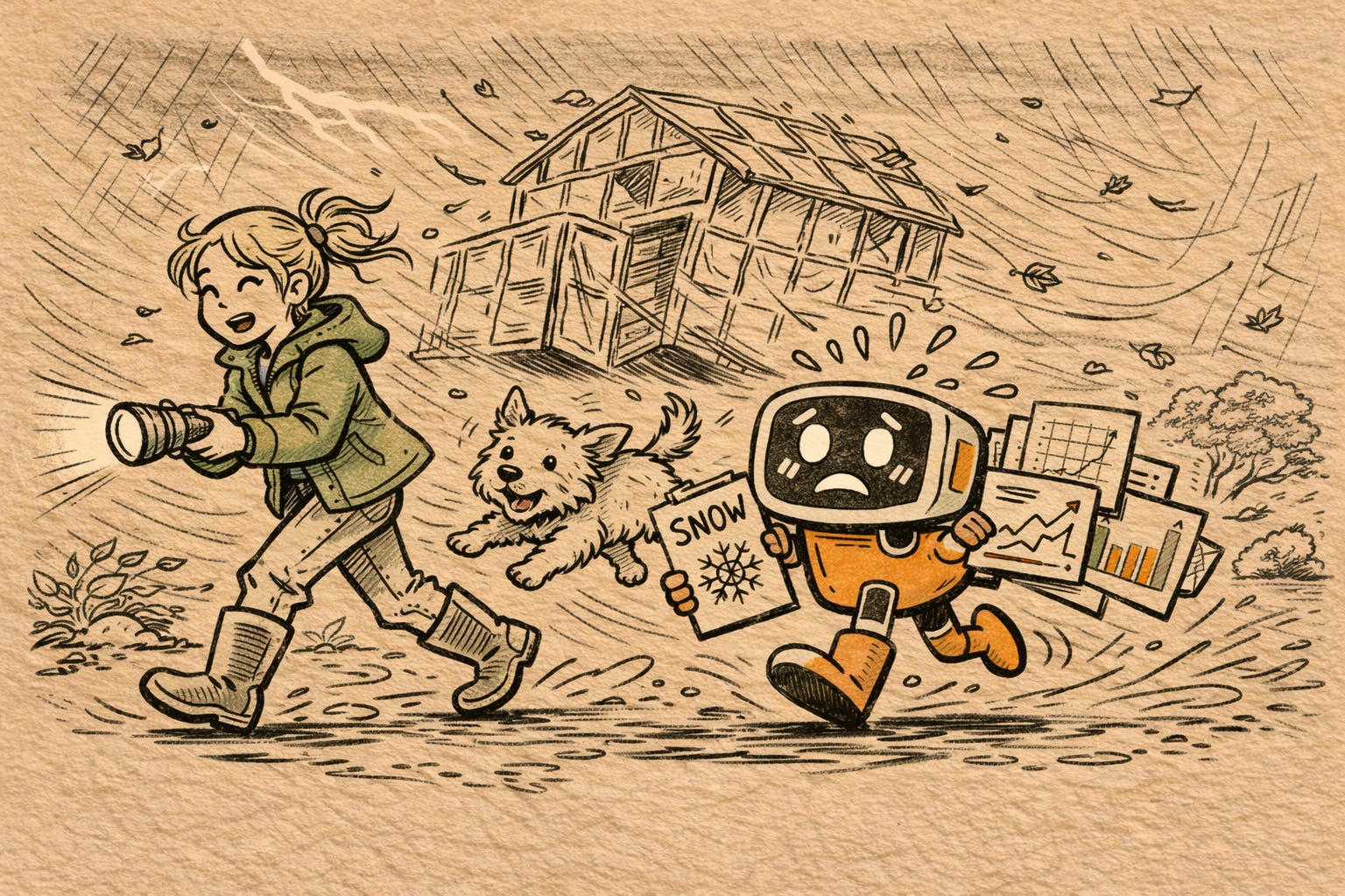 The forecast said snow. The temperature said 3 degrees and falling. The wind said northeast at 25 kilometers per hour and accelerating. And I was sitting in a laptop doing the only thing I know how to do in an emergency: reading weather data and issuing instructions to people who were already doing the right thing without me.